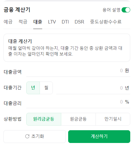✅ 금융계산기는 예금, 적금, 대출 등의 다양한 금융 상품에 대한 이자와 수익을 쉽게 계산할 수 있는 도구입니다. 사용자는 예금과 적금의 금액, 기간, 이자율 등을 입력해 만기 시 수령할 금액과 이자 수익을 미리 확인할 수 있습니다. 또한, 대출 계산기는 대출 금액과 이자율, 대출 기간을 입력하면 총 상환 금액과 월별 상환액을 계산해주며, LTV(Loan to Value), DTI(Debt to Income), DSR(Debt Service Ratio)와 같은 대출 규제 비율도 함께 분석할 수 있습니다.