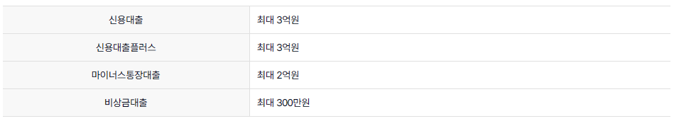 - 신용대출 및 신용대출플러스: 이 두 상품 모두 최대 3억원까지 대출이 가능하며, 신용상태와 상환 능력에 따라 한도가 차등 적용됩니다. 신용대출은 고신용자를 대상으로 하며, 신용대출플러스는 중·저신용자에게 적합합니다.