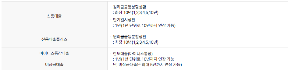 - 신용대출 및 신용대출플러스: 원리금균등분할상환 방식으로 최대 10년까지 상환 기간을 설정할 수 있습니다.